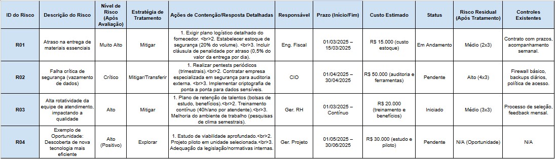 ◦ Tratamento: Mitigar o risco exigindo do fornecedor um plano detalhado de logística com prazos e rotas alternativas, monitoramento constante do estoque, e estabelecendo um estoque de segurança de materiais críticos no canteiro de obras.
